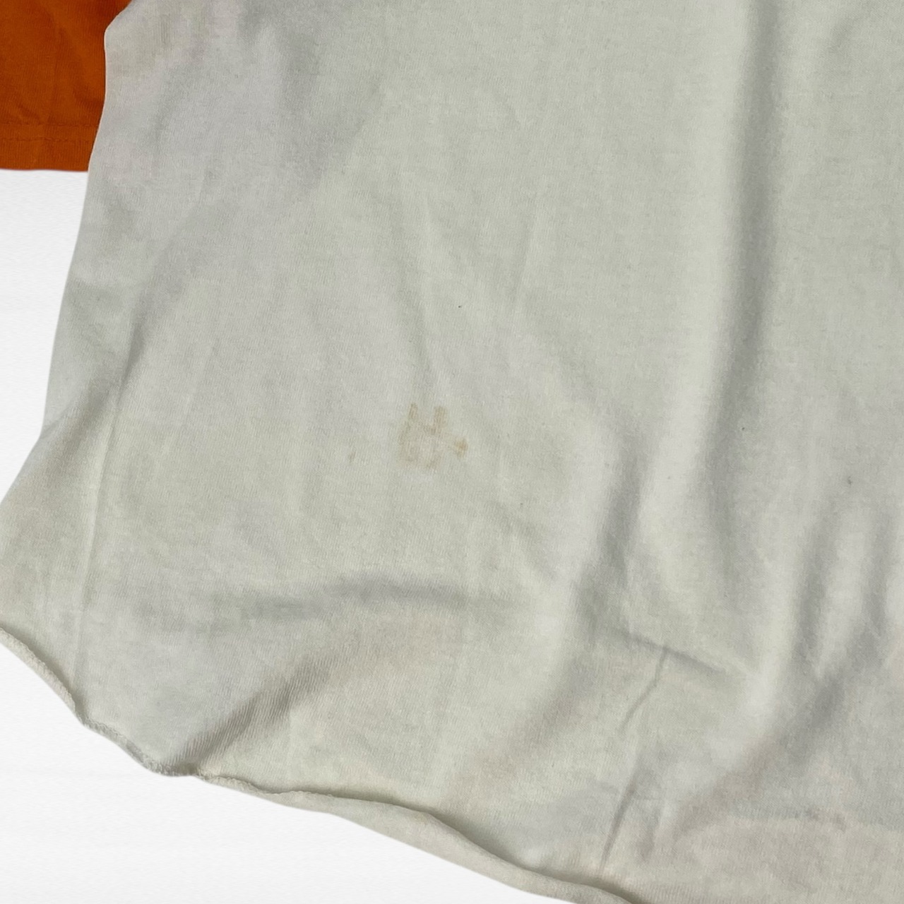 ホワイト×オレンジの抜群の配色で、ポリとコットンを使用した絶妙なヴィンテージならではの生地感もイナたさが出て非常に魅力的。