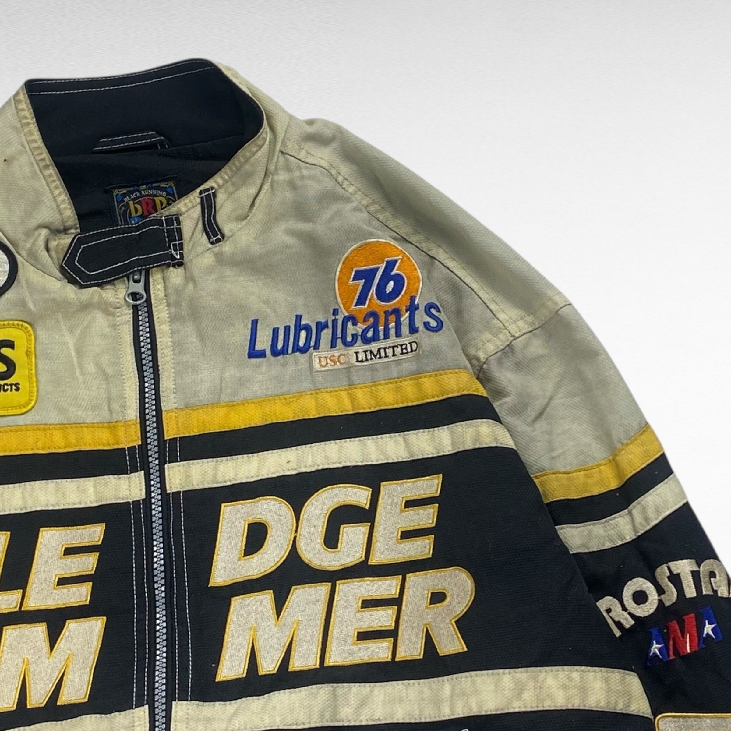 両面やスリーブに豪華な刺繍が入り、レーシングならではの非常にインパクトのある1着。