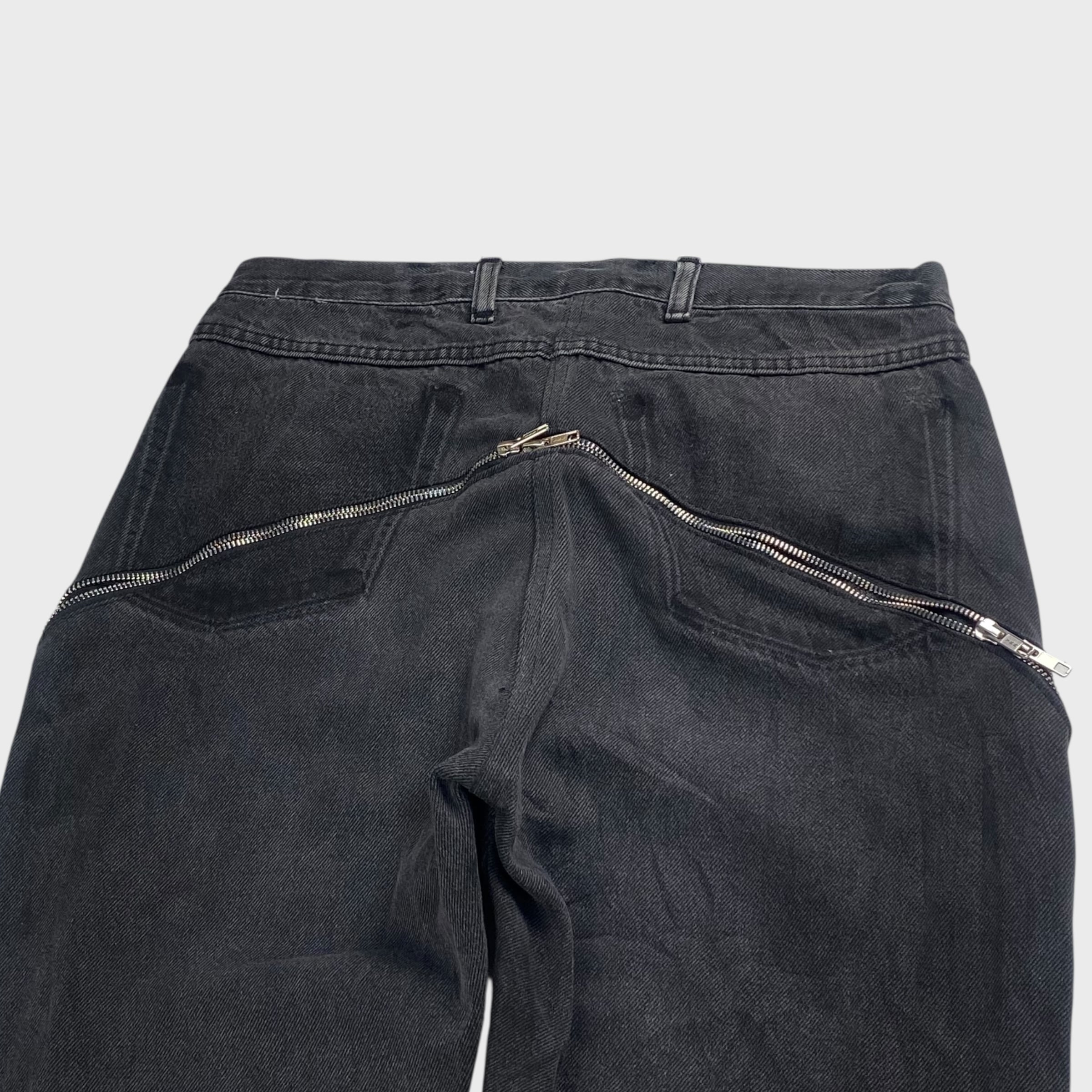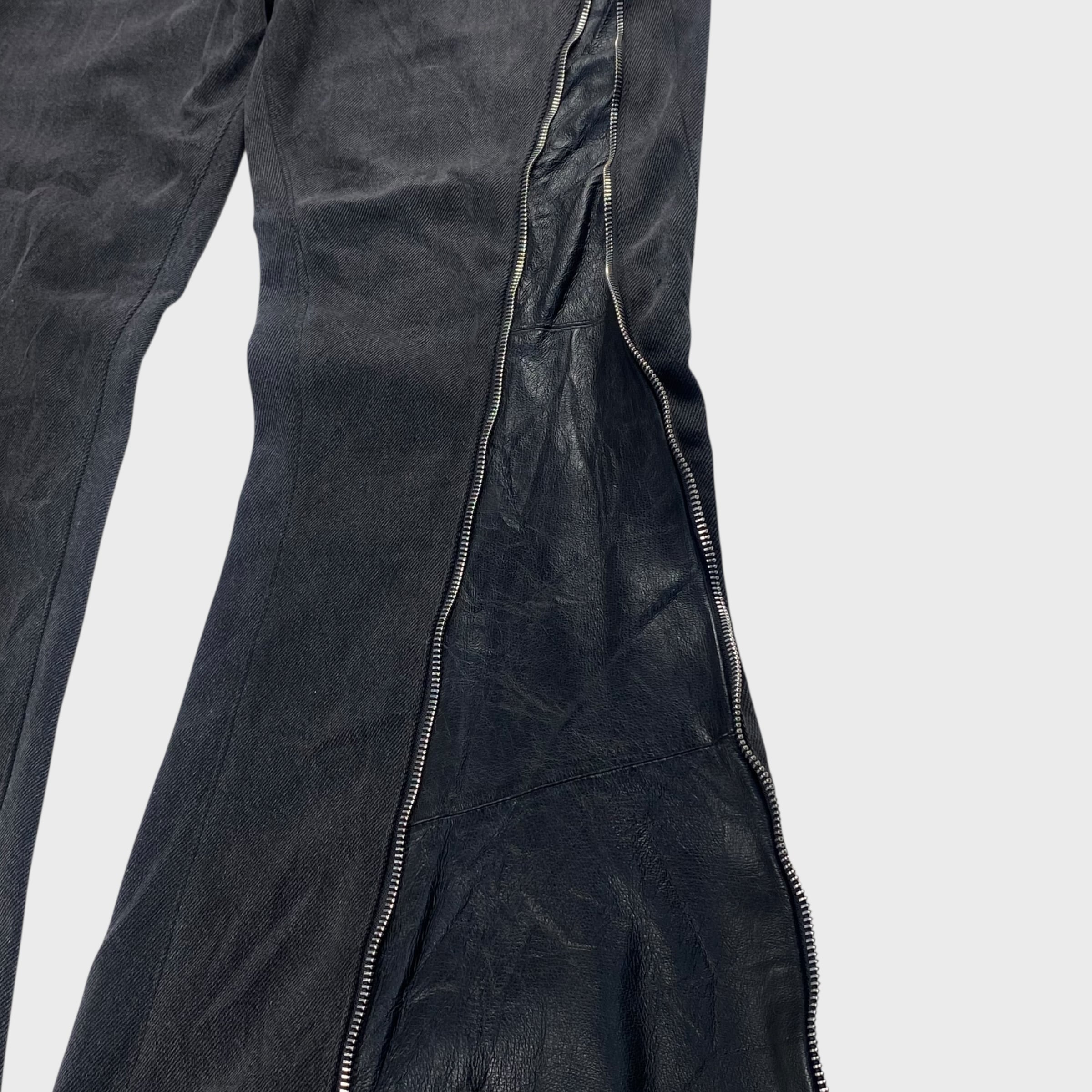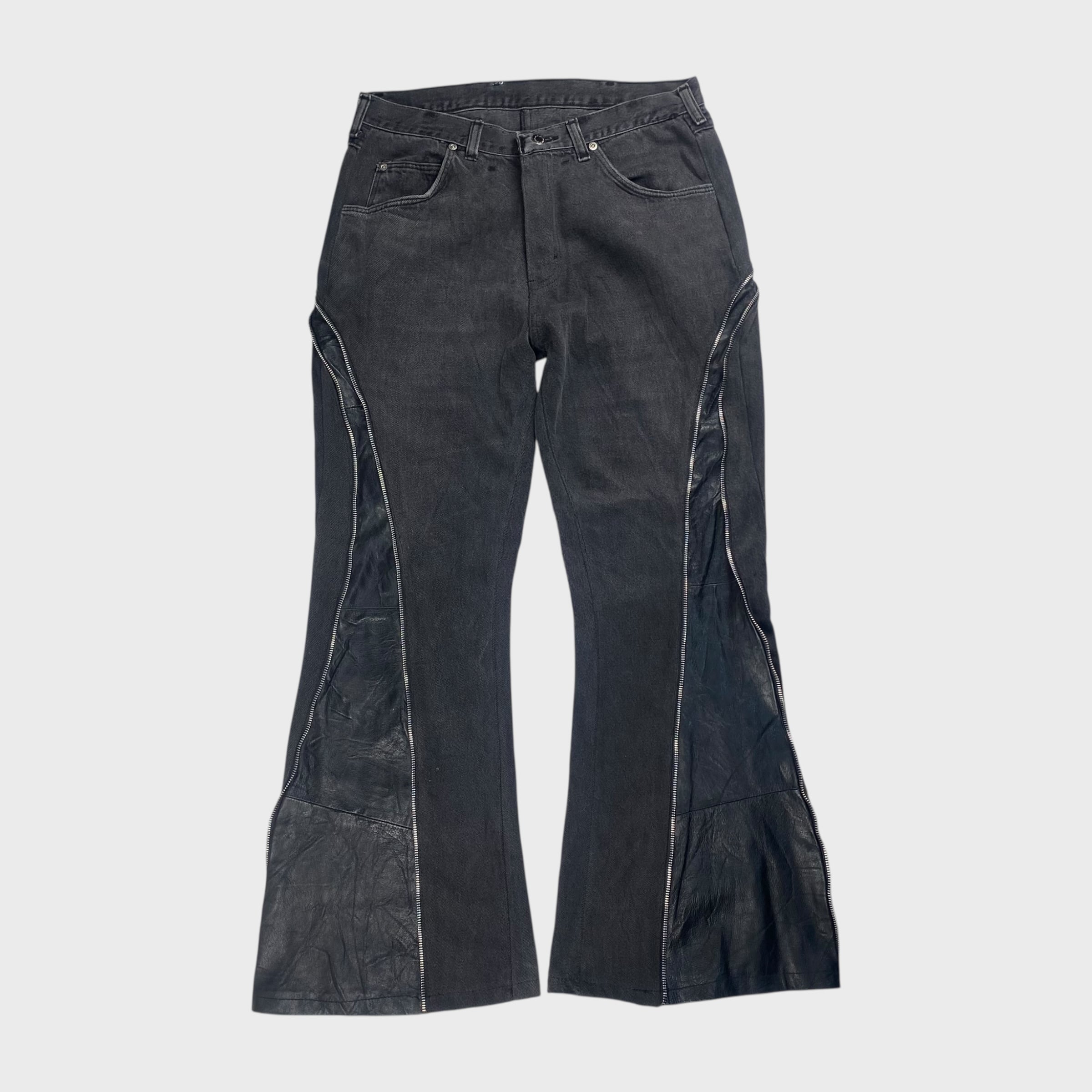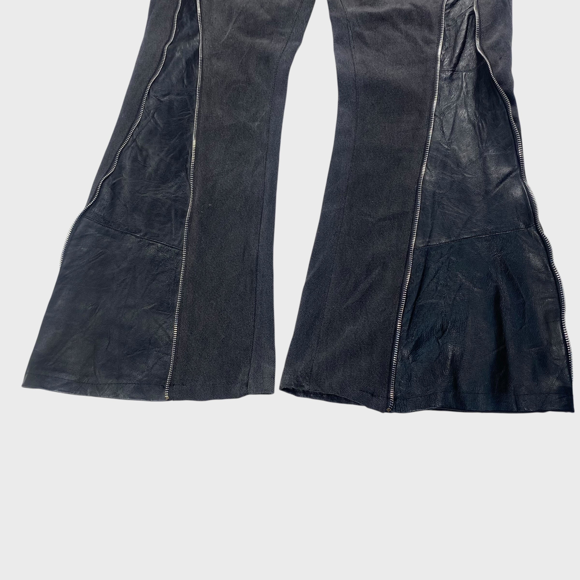 デニムパンツにレザーをドッキングさせ、さらにはジッパーも付けたオリジナルの個性溢れるリメイクフレアパンツ。