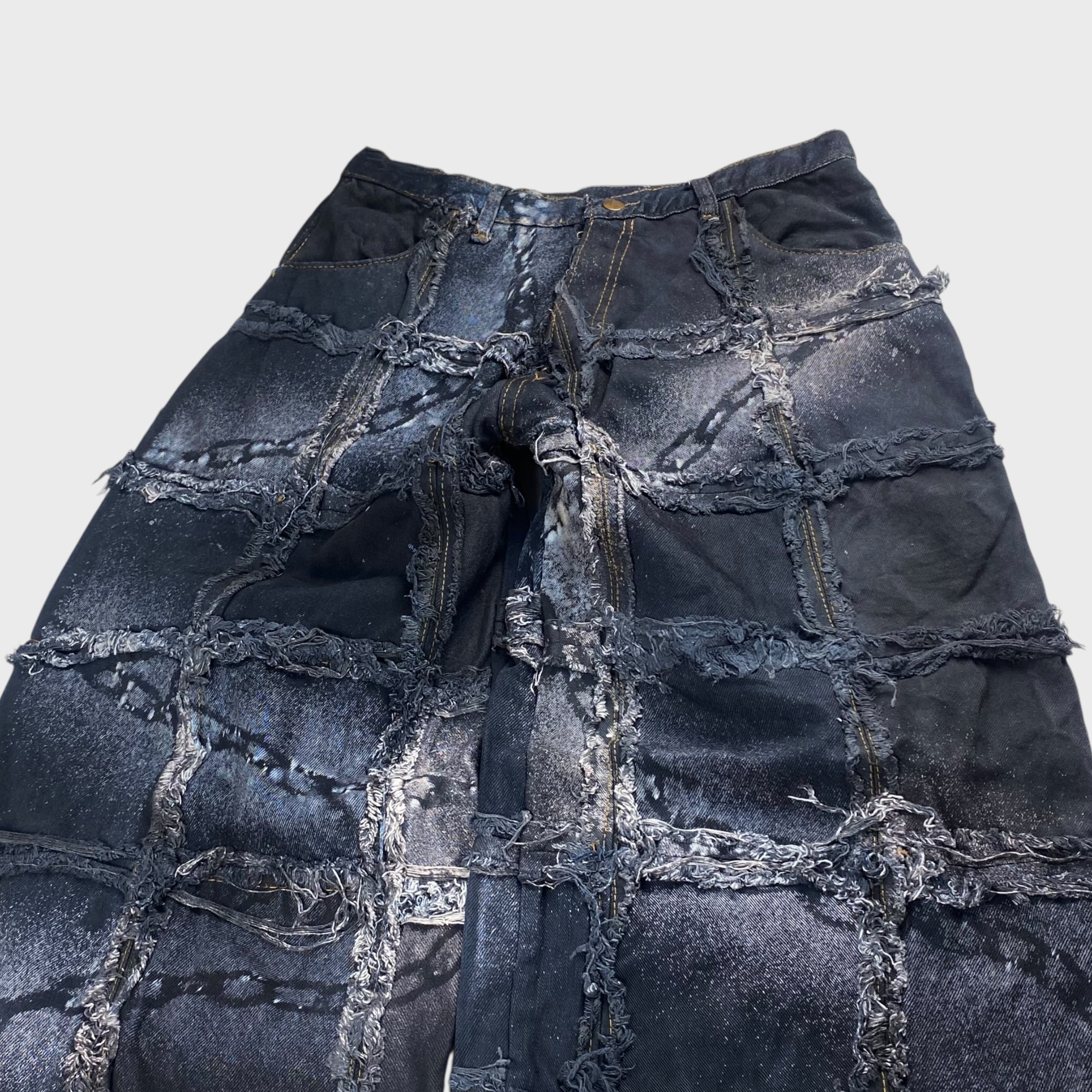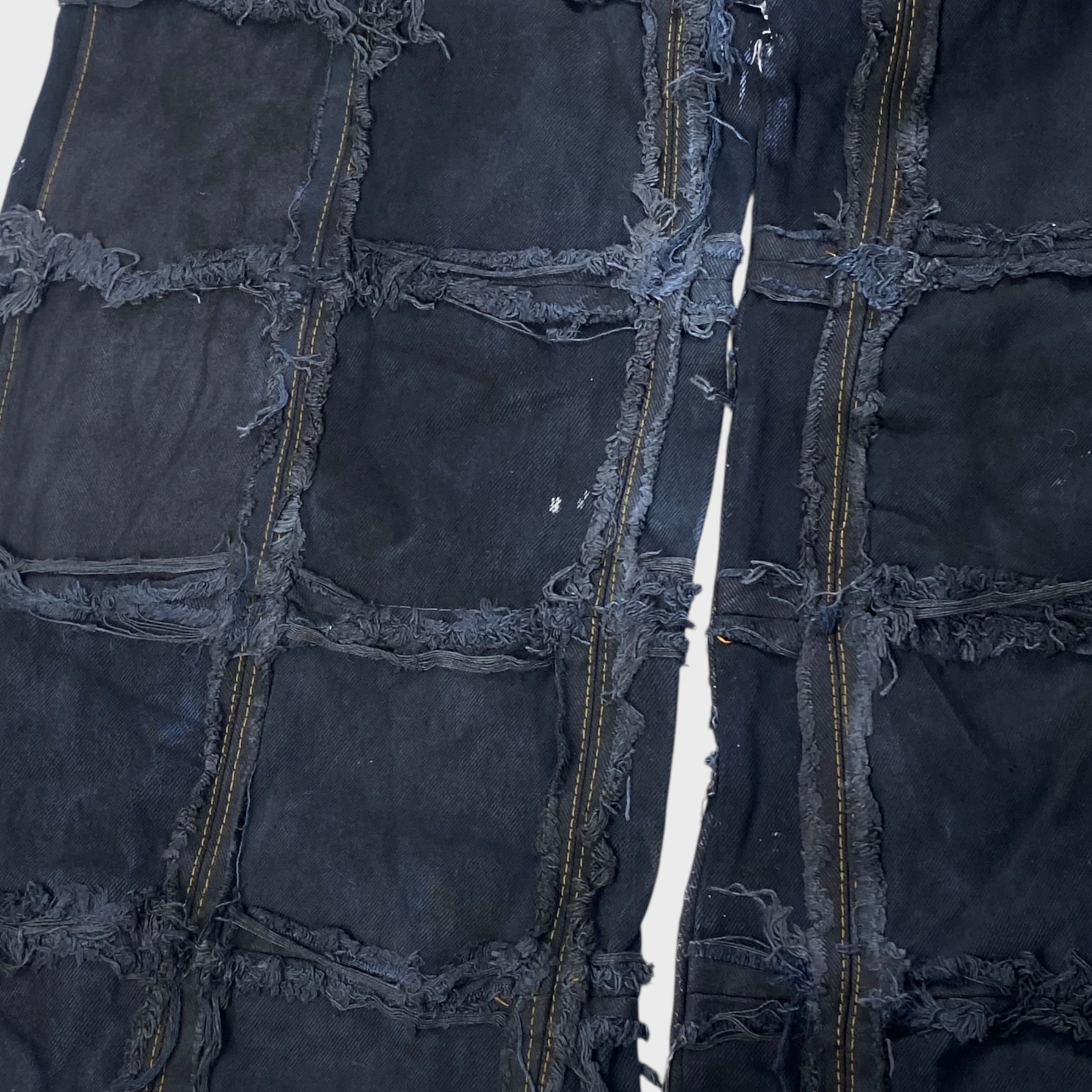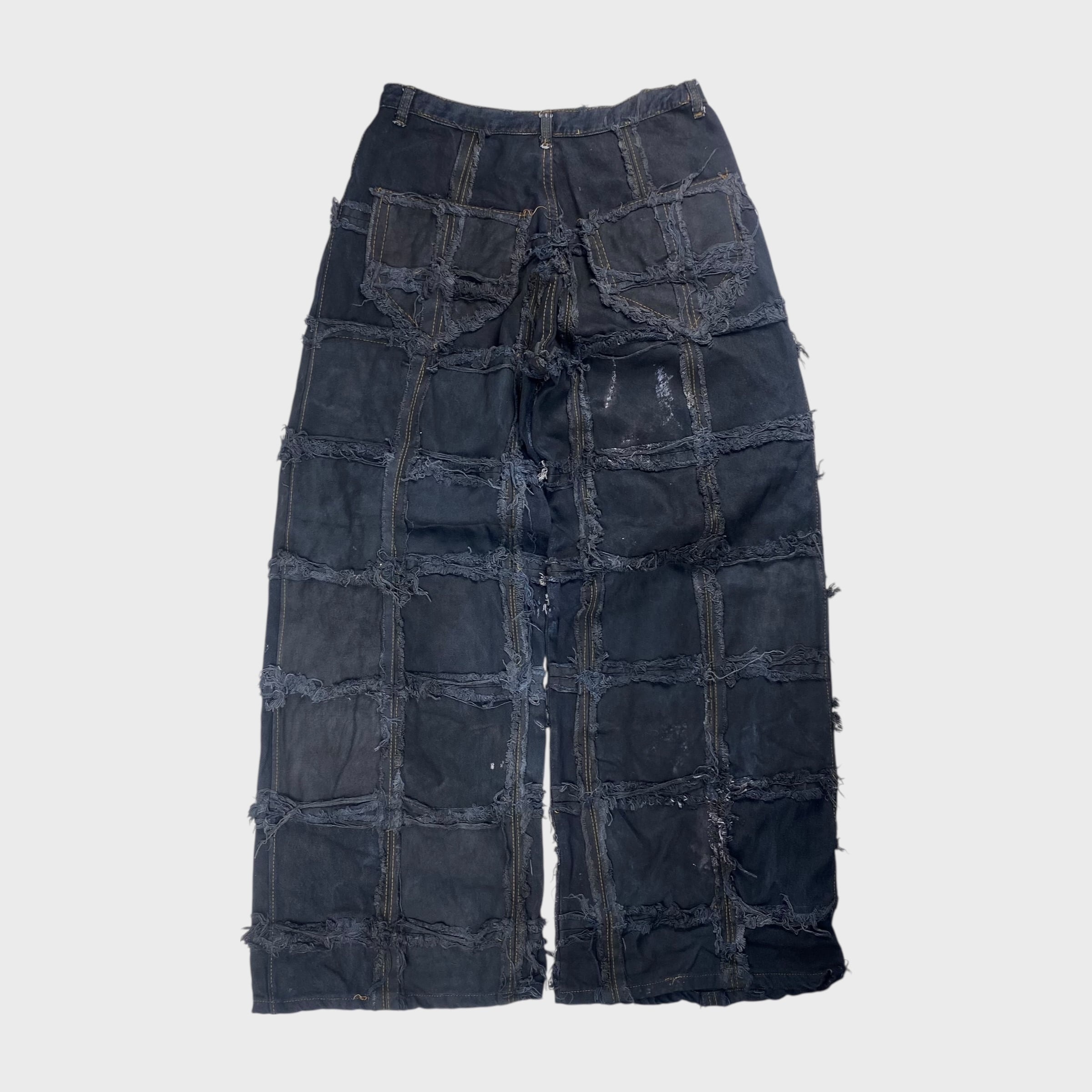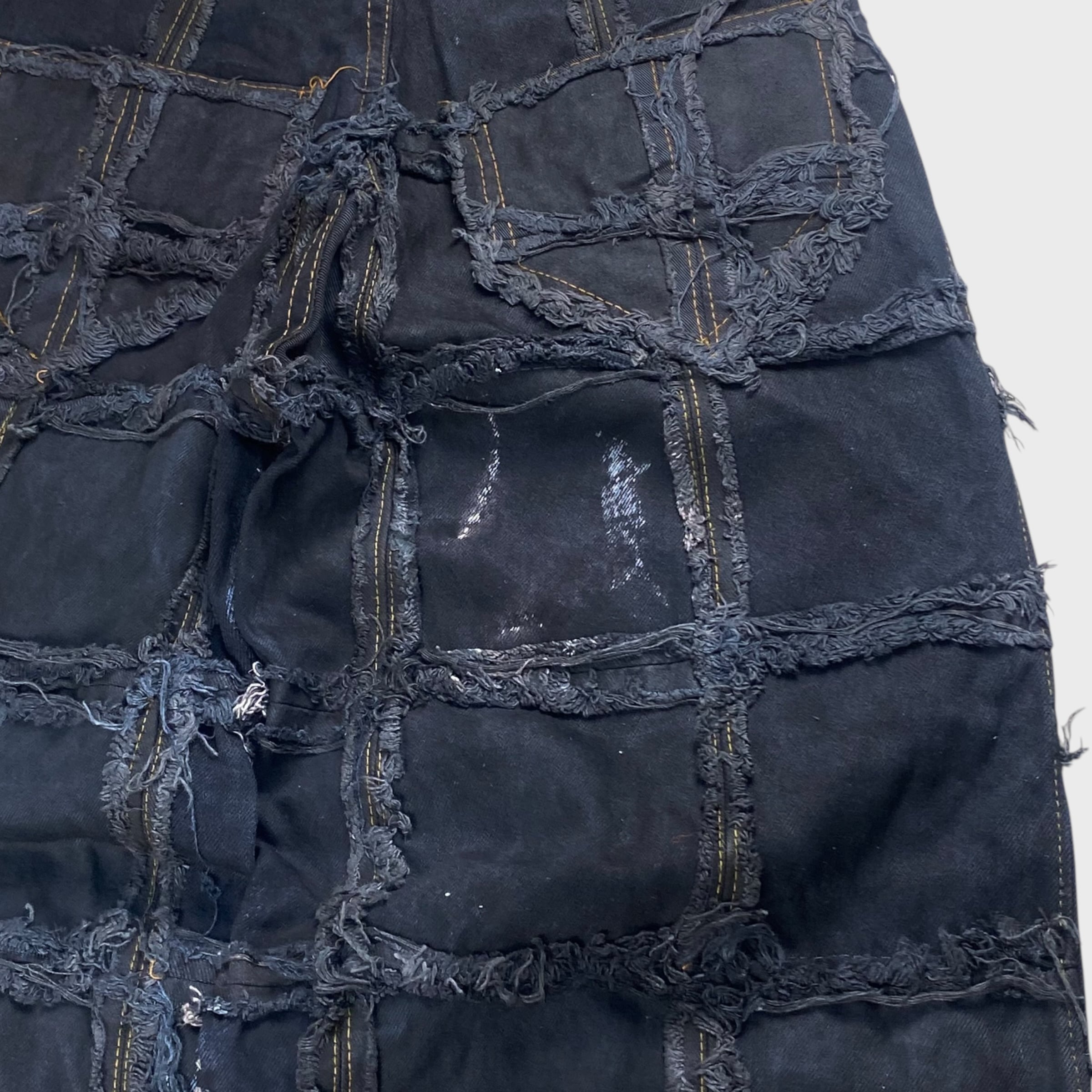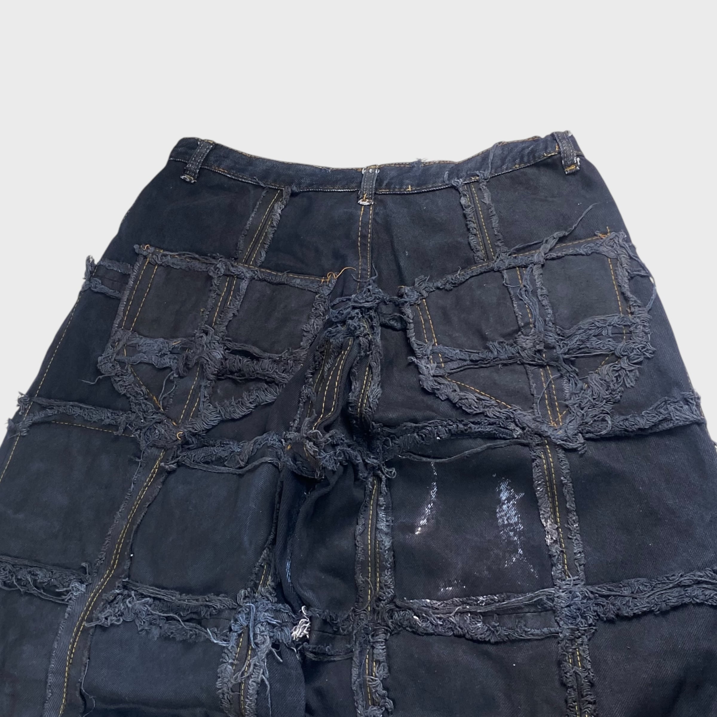 【REMAKE】【再構築】 パッチワークバギーデニムパンツ アートリメイク チェーン リメイク古着 ブラックデニム W31相当 dp6928