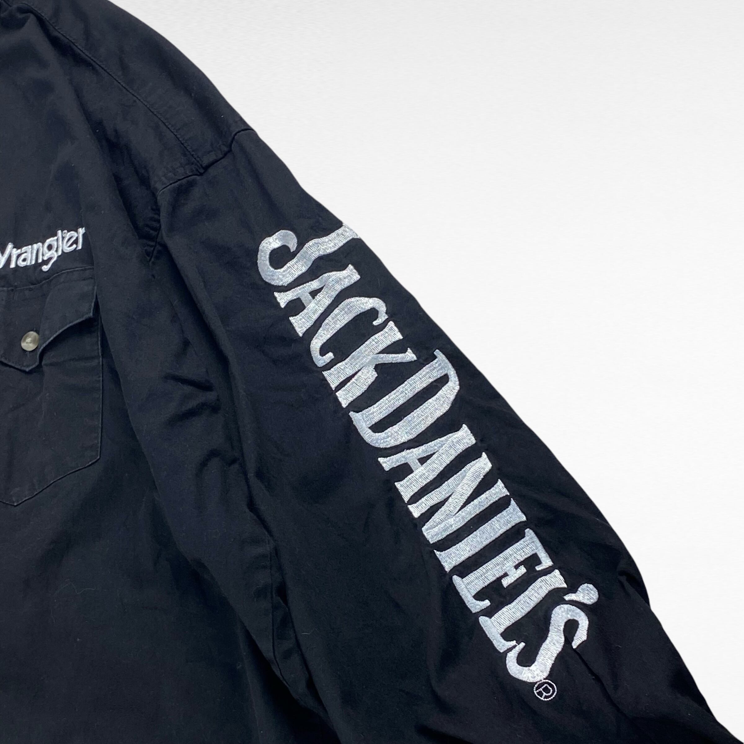 胸元にはラングラーとジャックダニエルのロゴが刺繍され、袖にはジャックダニエルの文字が刺繍されたアクセントの効いたデザイン。